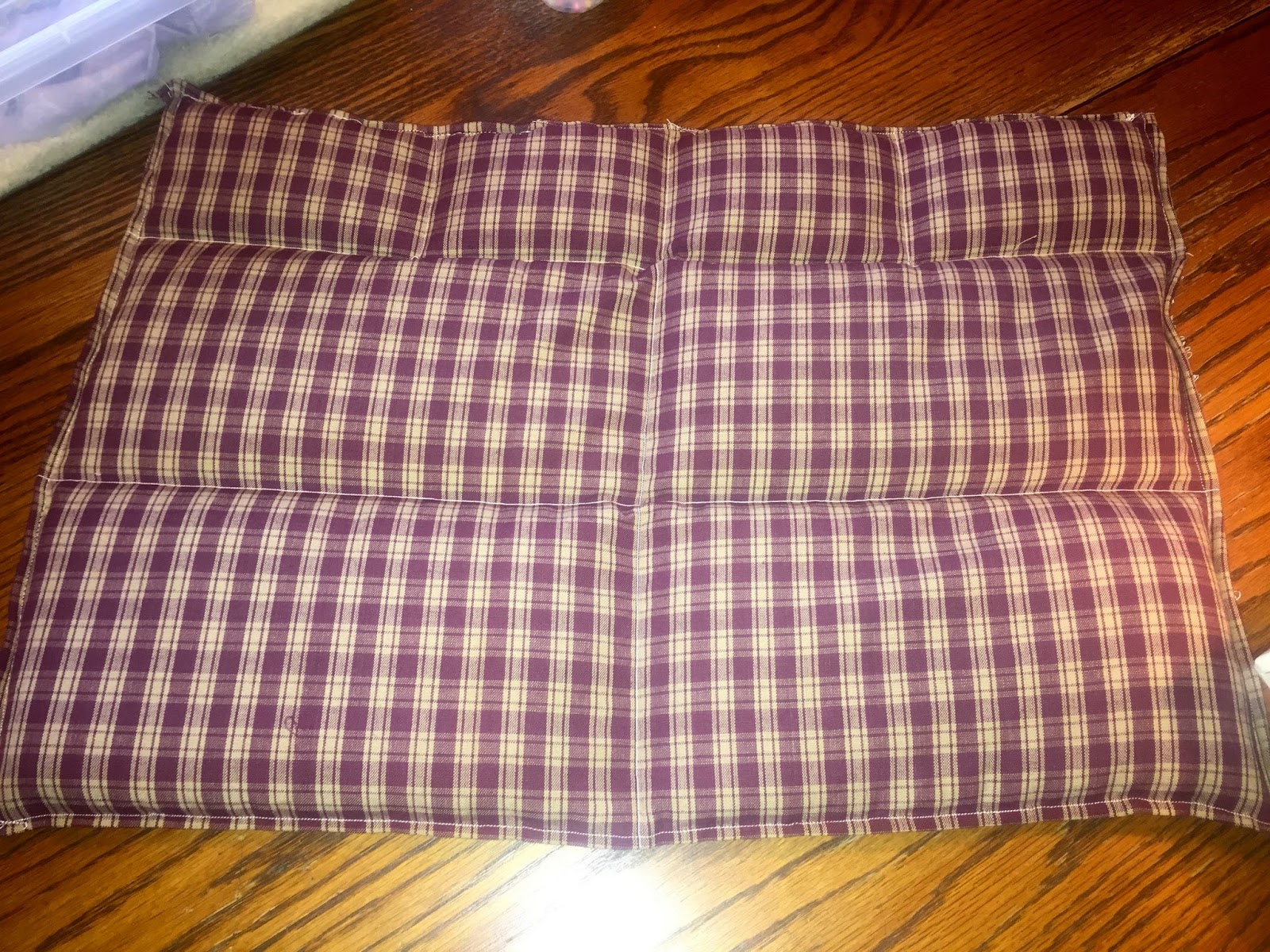 Next, I sewed the seams down all the way around. Then I folded the fabric in half and decided how large I wanted my rice “pockets” to be. I didn’t pin or mark these areas, again I just eyed it and sewed across the fabric leaving the outside edges open so that I could fill them with rice.